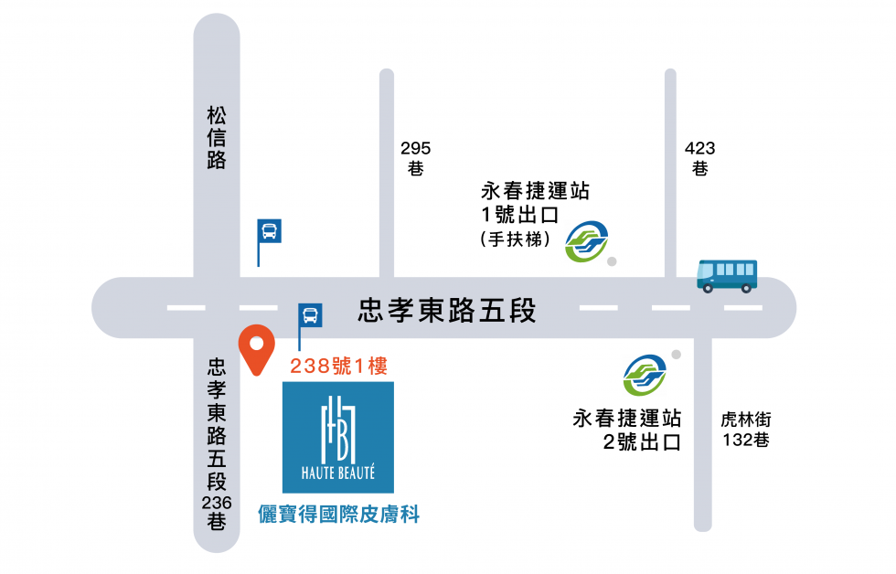 儷寶得國際皮膚科(醫學美容) 台北市信義區忠孝東路五段238號1樓 捷運(板南線): 【永春捷運站】2號出口,步行約7分鐘 公車: 【市立工農站】32、66、212、232、270、281、284、600、611、棕18、忠孝幹線、仁愛幹線
